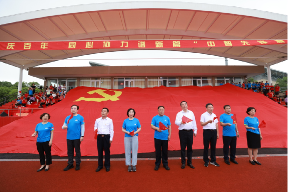 比賽間隙,組織了快閃活動(dòng),巨幅黨旗從主看臺(tái)鋪開(kāi),與會(huì)領(lǐng)導(dǎo)和全場(chǎng)高聲同唱《沒(méi)有共產(chǎn)黨就沒(méi)有新中國(guó)》,現(xiàn)場(chǎng)氣氛到達(dá)頂點(diǎn)。